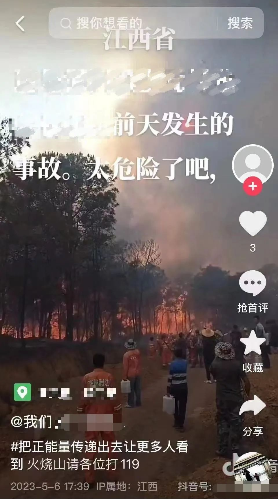5月7日,赣州市公安局蓉江新区分局网安部门工作发现,网民“我们是XXXX吧”于5月6日17时许发布两条火灾视频并配文称:“江西省某地前天发生事故,太危险了吧”,“火烧山请各位打119”,该视频引发网友关注和评论。