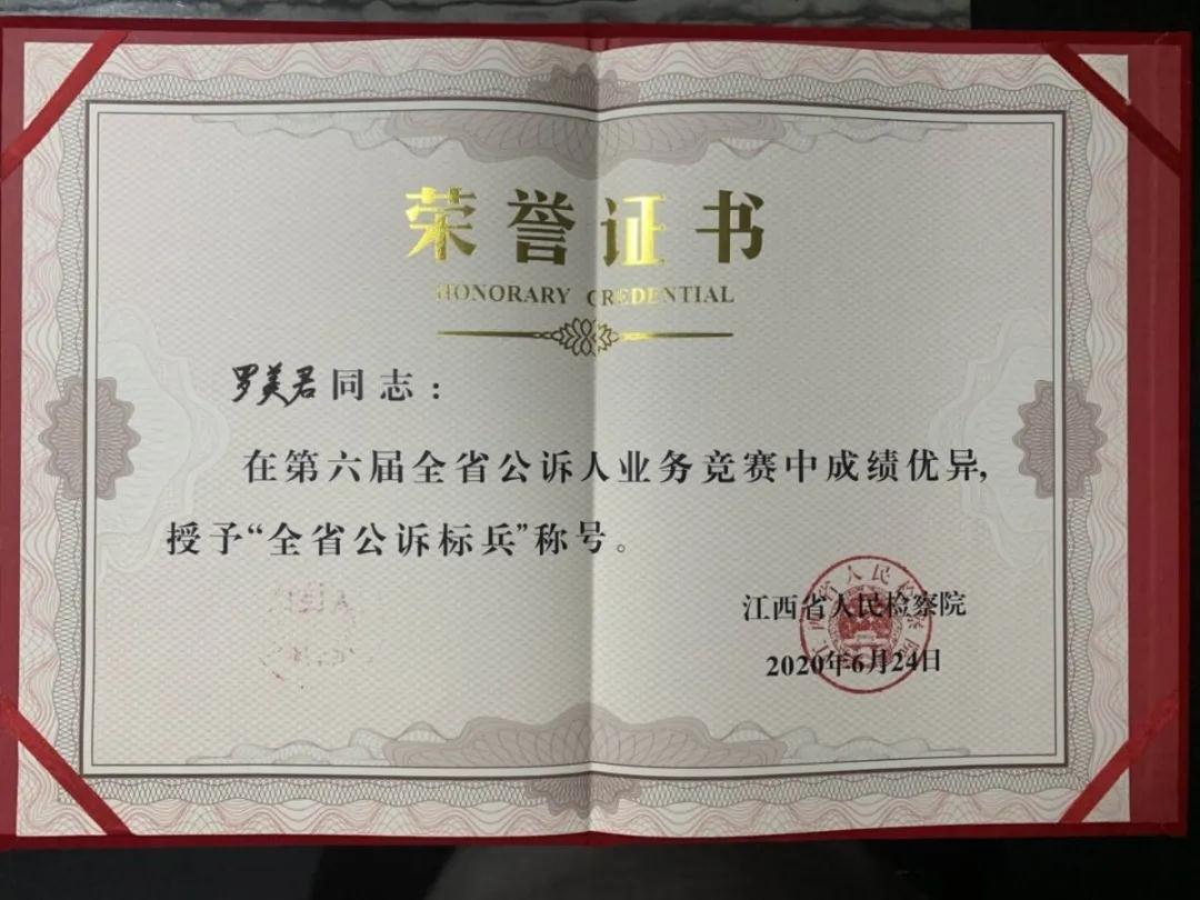 第一检察部员额检察官罗美君荣获“全省公诉标兵”称号;
