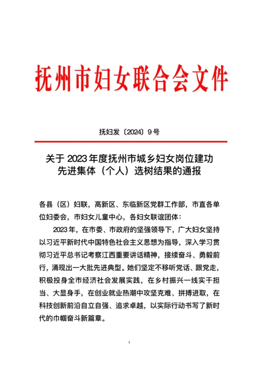 下发《关于2023年度抚州市城乡妇女岗位建功先进集体(个人)选树结果的通报》
