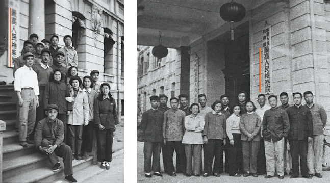 工作人员在最高人民检察署(左图)、最高人民检察院(右图)门口合影(档案类型:照片档案;保存地:最高检档案馆)
