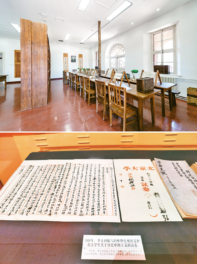 1920年,李大钊等在北京大学建立了一个小型图书室,取名“亢慕义斋”(亢慕义是英文共产主义的音译)。李大钊还开设了唯物史观、社会主义等课程,通过大学讲堂传播马克思主义。上图为“亢慕义斋”旧址展室(中新社发 赵雅丹/摄),下图为李大钊编写的唯物史观讲义和北大学生关于历史唯物主义的试卷。