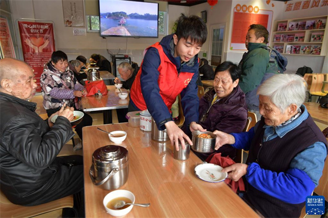 在江西省南昌市西湖区桃花镇河畔社区爱心餐厅,志愿者给就餐的社区居民送饭菜和汤(2021年11月24日摄)。近年来,桃花镇全额出资打造爱心餐厅,在社区登记的困难群众每天可以到爱心餐厅免费领取午餐和晚餐,解决了困难群众做饭难问题。新华社记者 彭昭之 摄
