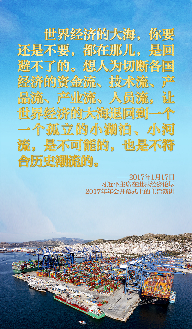 经济全球化何去何从?习近平主席在达沃斯论坛上作出明确回答:“世界经济的大海,你要还是不要,都在那儿,是回避不了的。想人为切断各国经济的资金流、技术流、产品流、产业流、人员流,让世界经济的大海退回到一个一个孤立的小湖泊、小河流,是不可能的,也是不符合历史潮流的。”