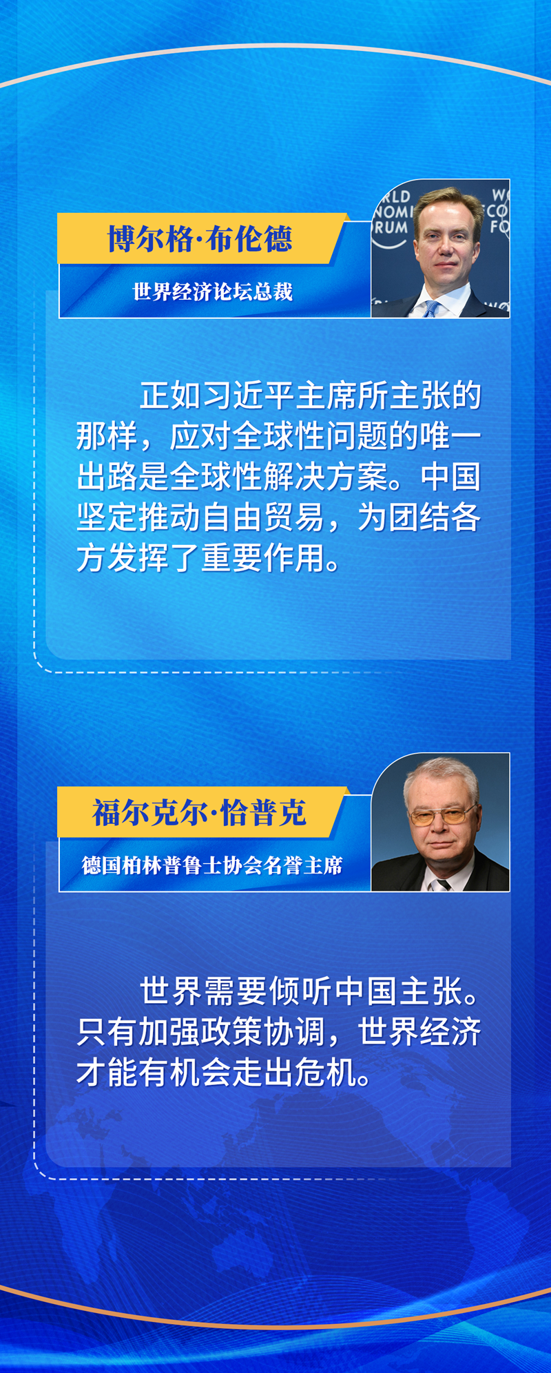 今年的达沃斯论坛年会以“在分裂的世界中加强合作”为主题。对习近平主席的主张,世界经济论坛总裁博尔格·布伦德深表认同。他说,应对全球性问题的出路是全球性解决方案。“中国坚定推动自由贸易,为团结各方发挥了重要作用。”