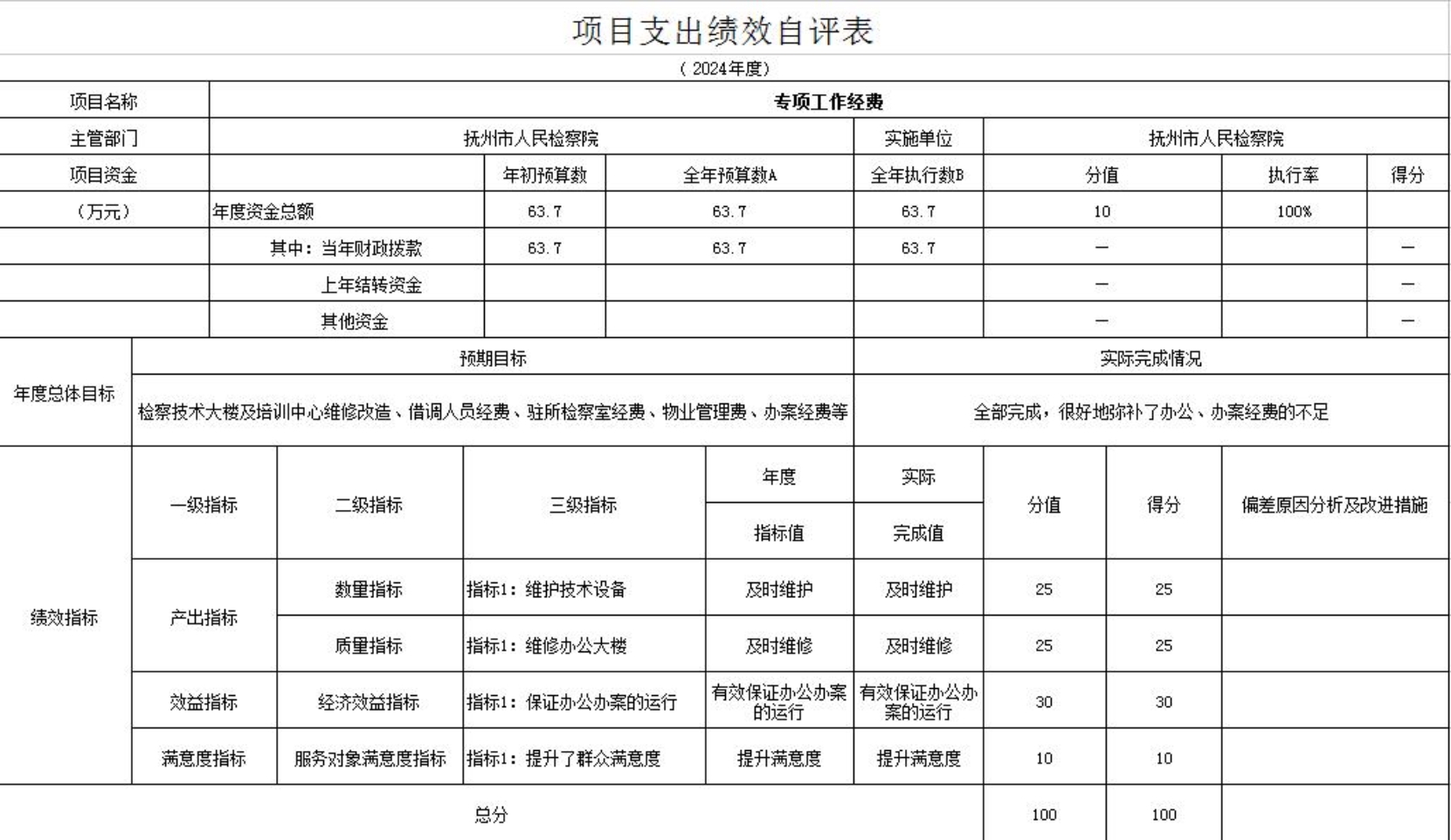 本部门“抚州市人民检察院专项工作经费”“抚州市人民检察院聘用制书记员” 项目支出绩效自评结果如下: