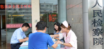 (本网讯 何茶花)8月11日,市检察院积极组织干警职工参加无偿献血活动。市院党组成员、政治部主任陈志祥带头参加,市院技术处处长罗波涛,案管办主任王建荣,干警游国顺、黄凯、何茶花,章国杰家属,职工王海华等8名同志积极响应号召,踊跃参加无偿献血活动。