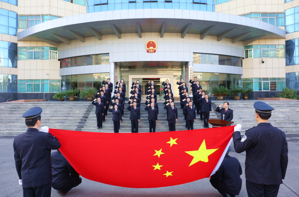 宋智勇检察长抚按《中华人民共和国宪法》,带领40余名新提拔任用、等级职级晋升以及新入职的检察人员,面向鲜艳的国旗,举起右拳,队伍整齐、声音洪亮,庄严宣誓、郑重承诺!