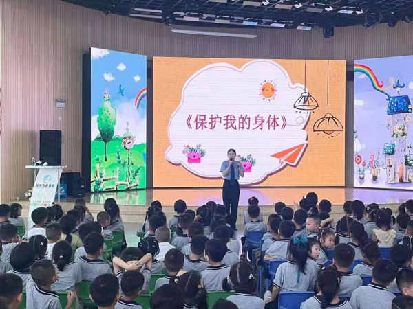 随后,“刘莹姐姐”为370余名中班小朋友带来了一堂题为《保护我们的身体》的法治小课堂。以生动的语言、形象的图画、有趣的现场互动,向小朋友讲解什么是隐私部位、如何保护隐私部位、遇到危险时如何启动防护警报等。课后,普法小分队还为现场的孩子们发放了精心制作的儿童普法宣传手册。