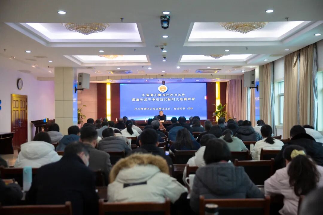 驻院纪检监察组组长、党组成员何辉以《永葆清正廉洁的政治本色 锻造忠诚干净担当的新时代检察铁军》为题,以案说法,以案明纪,讲授了一堂内涵丰富、发人深省的廉政党课,教育引导干警坚持严于律己、秉公用权、廉洁自律,增强党性修养、传承优良作风、永葆政治本色。